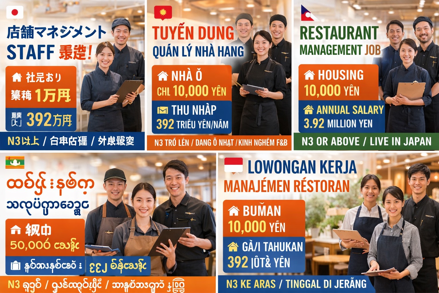【特定技能 外食】店舗マネジメント社員/年収392万円/社宅あり(自己負担1万円)