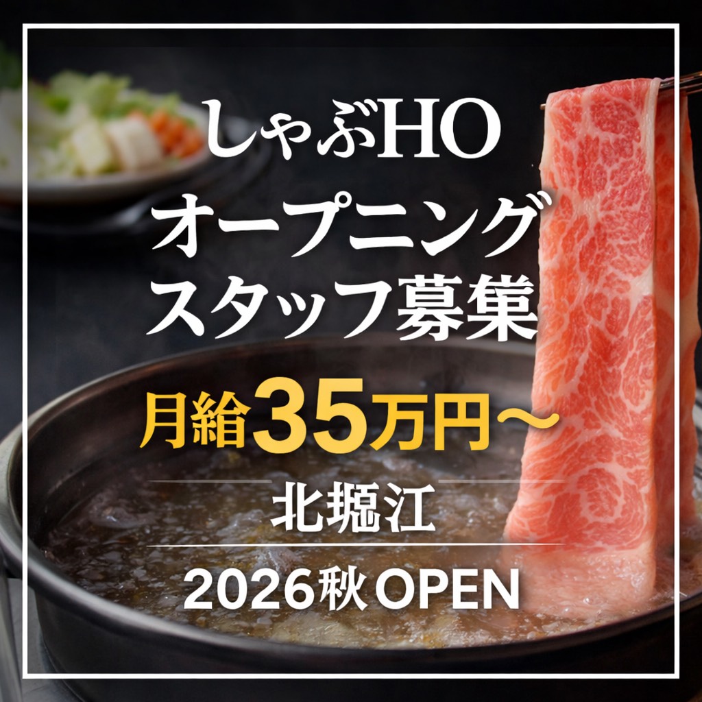 | アピールポイント | ・2026年秋オープン予定の新店舗 ・オープニングスタッフ募集 ・月給35万円スタート(店長候補) ・客単価約8,000円のしゃぶしゃぶ専門 店 ・夜営業のみ(16:00~22:00) ・北堀江エリア勤務 |