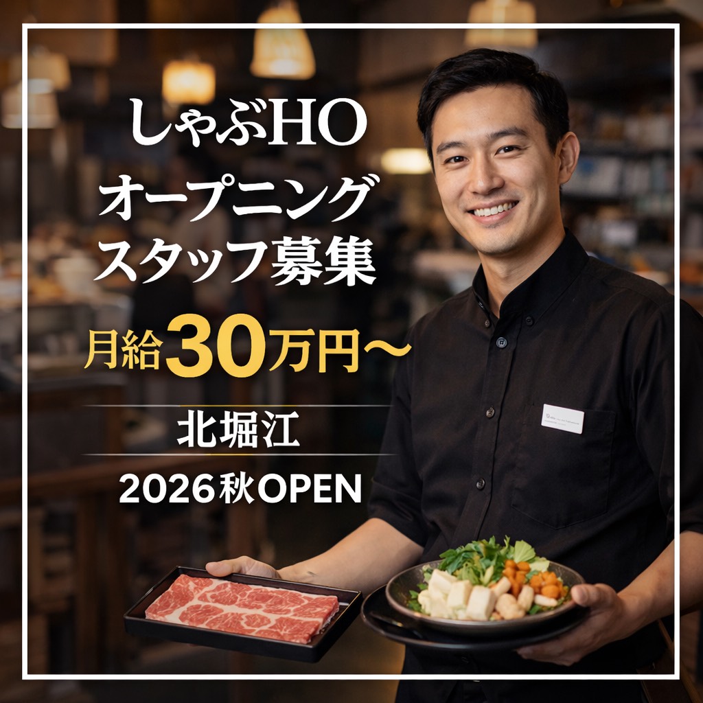 | アピールポイント | ・2026年秋オープン予定の新店舗 ・オープニングスタッフ募集 ・客単価約8,000円のしゃぶしゃぶ専門店 ・夜営業のみの店舗 ・北堀江エリア勤務 |